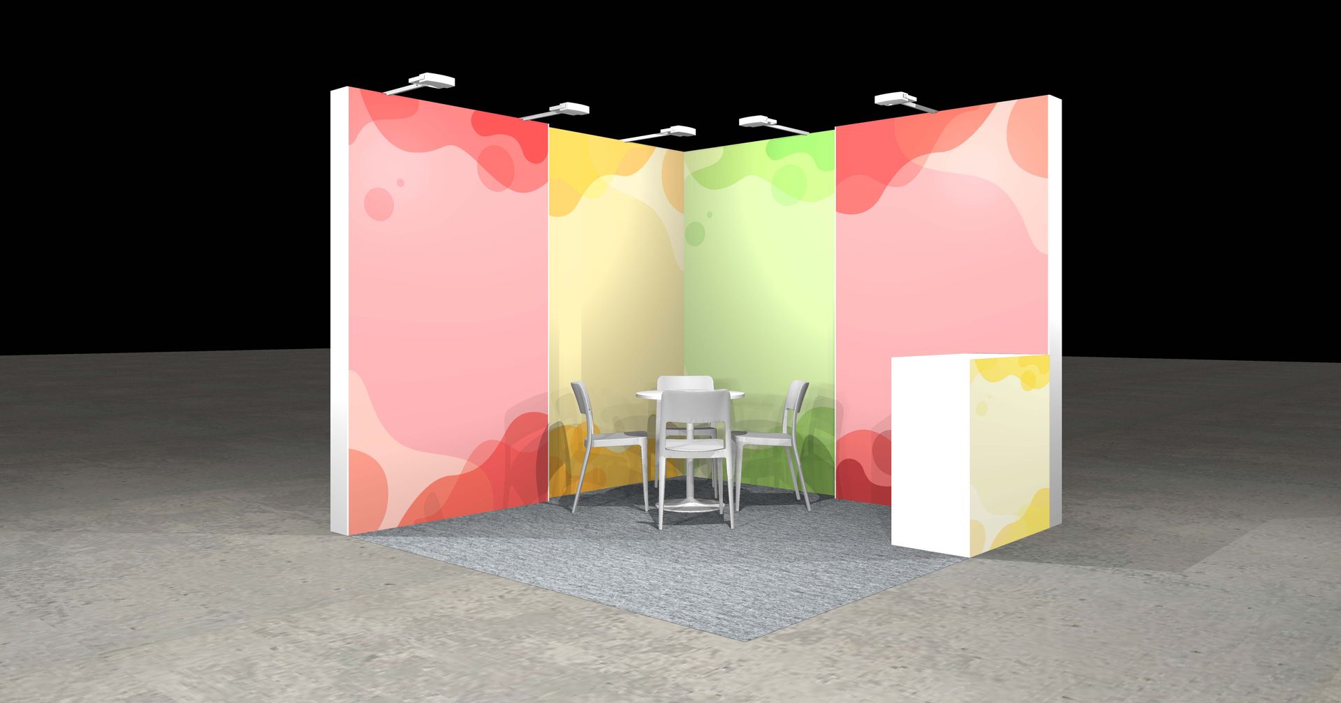 Stand con pareti interamente graficate, illuminazione, moquette a terra, desk, un tavolo e quattro sedie a partire da €3.000,00